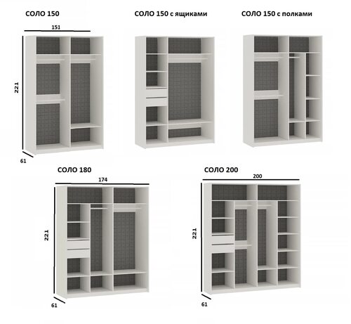 Шкафы купе Соло Барбара предлагают широкий выбор вариантов дизайна, от классических до современных. Благодаря разнообразию отделений, полок, ящиков и зеркал, каждый может подобрать оптимальный вариант для своего интерьера.