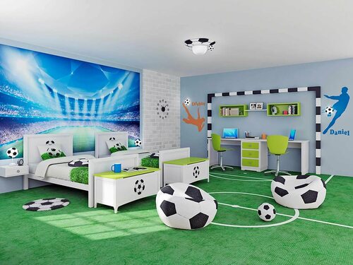 Основные цвета для футбольного дизайна комнаты – зеленый, черный, белый и красный. Можно использовать эти цвета как основные, а также добавить акценты в виде футбольных мотивов.