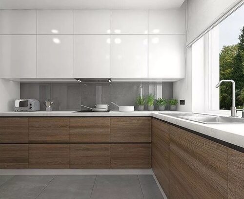 Кухня в современном стиле с комбинацией серых нижних и белых верхних шкафов, столешницей под дерево - отличный выбор для современного интерьера. Этот дизайн придает кухне свежий и стильный вид, а также создает уютную атмосферу.