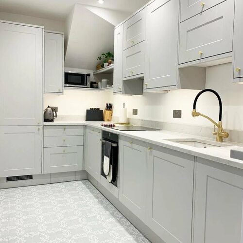 Светло серая кухня с белой столешницей - это элегантный и современный выбор для любого дома. Нейтральные оттенки создают уютную атмосферу, а белая столешница придает пространству светлоту и воздушность.