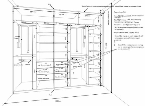 Наполнение шкафа купе 3 метра 4 двери с размерами