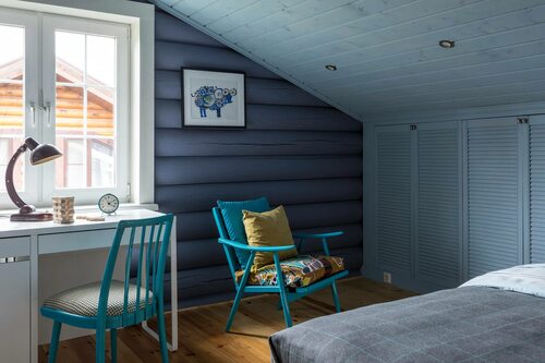 Бирюзовая спальня в деревянном доме
