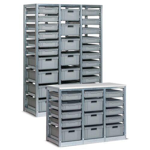 Складской стеллаж с черными ящиками 700 6 ch - отличное решение для организации хранения в складских помещениях, мастерских и гаражах. Этот стеллаж обеспечивает надежную поддержку для ящиков и позволяет эффективно использовать пространство.