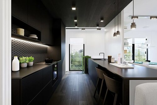 Дизайн кухни с темным потолком может создать уникальный и стильный интерьер. Темный потолок может придать кухне уют и элегантность, добавляя глубину и характер помещению.