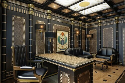 Этот стиль характеризуется использованием изысканных тканей, золотых и черных оттенков, а также мебели с декоративными элементами, напоминающими древнеегипетские артефакты.