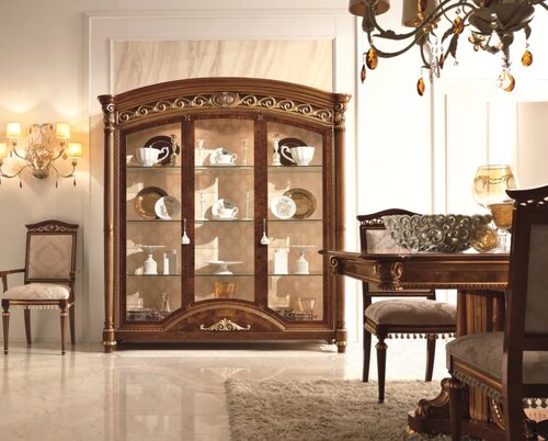 Классический буфет в гостиной часто украшен изящными резными деталями, золотистыми узорами и изысканными фигурными ножками. Это создает величественный и роскошный вид, который прекрасно вписывается в классический интерьер.