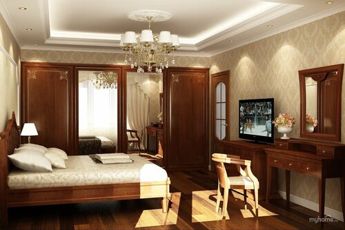 Для создания интерьера классической спальни с темной мебелью используются элементы декора в стиле антиквариат. Лепнина, массивная мебель, мягкие ткани и золотые акценты помогают достичь желаемого эффекта.