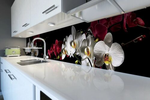 Белая кухня с цветным фартуком и орхидеями - это современный и стильный выбор для интерьера. Она придает пространству светлую и свежую атмосферу, а яркий фартук с орхидеями добавляет кухне яркие акценты.