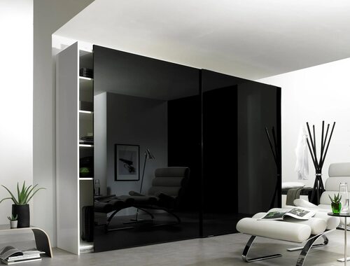 Шкафы купе из темного стекла сочетают в себе стильный внешний вид и практичность. Они могут быть оснащены различными системами хранения, позволяющими эффективно использовать пространство. Благодаря стеклянным дверям, визуально увеличивается пространство в комнате, что делает интерьер более светлым и просторным.