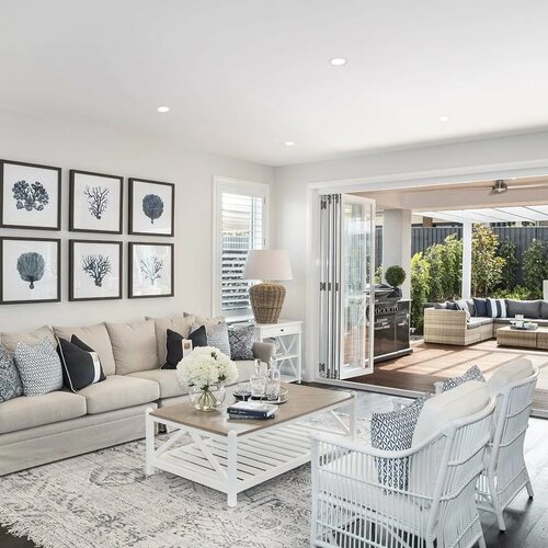 В интерьере в стиле Хэмптонс присутствуют такие элементы, как светлые оттенки, натуральные материалы, текстиль с морскими узорами, деревянная мебель, а также акценты в виде морских мотивов и растений. Важным элементом является также естественное освещение и открытая планировка помещений.