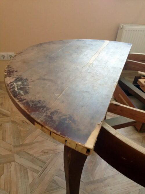 Перед началом реставрации необходимо тщательно очистить и подготовить поверхность стола. Удалим старое покрытие и шлифуем поверхность до гладкости.