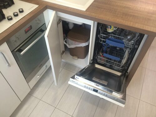 Проект кухни угловой 6 кв.м с холодильником и посудомойкой