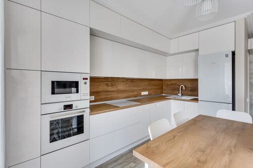 Белая кухня с двухуровневым дизайном и деревянной столешницей - это элегантное и функциональное решение для современного интерьера. Такой стиль подчеркнет простор и свет в помещении, а деревянная столешница добавит тепла и уюта.