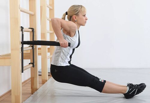 Для выполнения приседаний на шведской стенке станьте спиной к стенке, держась за перекладину. Медленно опуститесь вниз, сохраняя правильную форму тела, затем вернитесь в исходное положение. Повторите упражнение несколько раз.