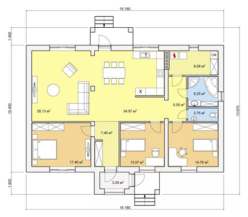 Одноэтажный каркасник с 4 спальнями