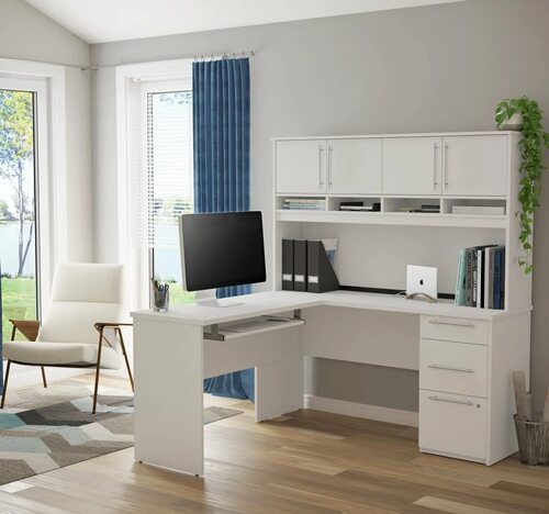 Угловой белый письменный стол с надстройкой и шкафчиками - это практичное и стильное решение для любого рабочего пространства. Он позволяет оптимально использовать угловое пространство комнаты, обеспечивая максимальную функциональность и удобство.