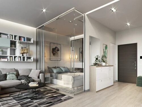 Однокомнатная квартира в стиле минимализма с акцентом на функциональность. Чистые линии, нейтральные цвета и множество удобных хранительных систем делают этот проект прекрасным примером современного дизайна.
