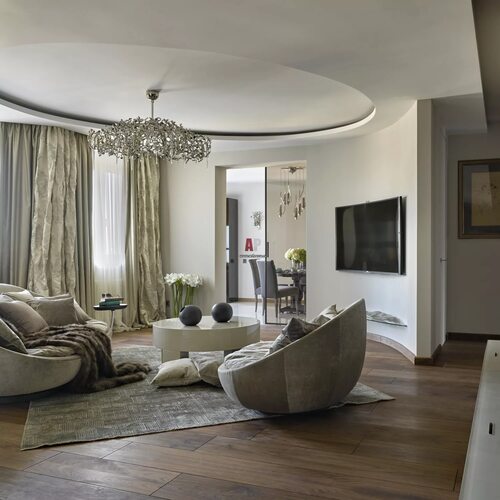 При создании интерьера гостиной с полукруглой стеной можно использовать различные декоративные приёмы, такие как подсветка, зеркала, фоторамки и другие элементы, чтобы подчеркнуть уникальность этой архитектурной особенности.