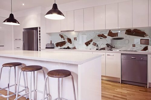 Белая кухня с фотопечатью на фартуке