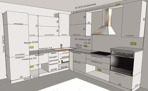 Кухня угловая с пеналом для духовки и микроволновки схема