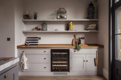 Вместо верхних шкафов можно использовать открытые полки, подвесные стеллажи, подвесные крючки для кухонной утвари, а также другие оригинальные решения для хранения посуды и кухонных принадлежностей. Такой дизайн придает кухне современный и легкий вид, а также позволяет экономить пространство и делает кухню более функциональной.