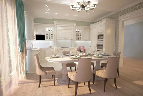 Неоклассическая кухня-столовая часто украшается карнизами, пилястрами, стуккатуркой и изящными люстрами. Мебель в этом стиле обычно имеет изогнутые ножки, декоративные резные элементы и мягкие обивки с капитоне.