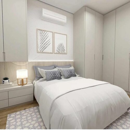 Для маленькой спальни особенно важно выбирать компактную мебель, которая не загромождает пространство. Шкаф с зеркальными фасадами или раздвижные двери помогут визуально увеличить комнату. Разместите кровать у стены, освободив центр помещения, и выберите небольшой, но вместительный шкаф, который не создаст чувства тесноты.