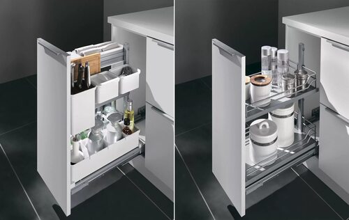 Один из основных элементов для удобного наполнения кухонных шкафов - это органайзеры. Они позволяют разделить пространство на зоны, удобно хранить посуду, продукты и кухонные принадлежности. Существует множество различных органайзеров: от выдвижных корзин и подставок для сковородок до специальных вставок для посуды и продуктов.