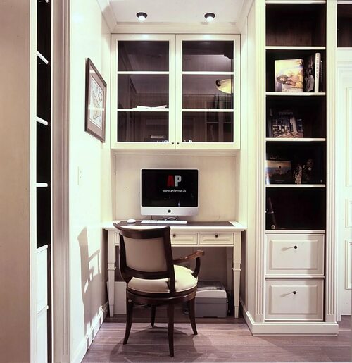 Примеры фотографий рабочих уголков в квартире с полками и шкафом: