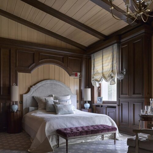 Для спальни в классическом стиле в деревянном доме подойдет мебель из натурального дерева с изящными резными элементами. Кровать с высоким изголовьем, тумбочки, комоды и шкафы должны быть выполнены в классическом стиле, с утонченными деталями и изысканными фурнитурными элементами.