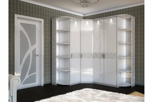 Белый цвет шкафа придает гостиной светлую и воздушную атмосферу, визуально увеличивая пространство. Угловой шкаф купе позволяет компактно разместить одежду, обувь, посуду и другие предметы, освобождая полезное пространство в комнате. Благодаря разнообразию внутренних наполнений, можно создать оптимальный вариант для хранения любых вещей.