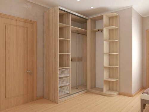 Угловой шкаф позволяет оптимально использовать угловое пространство, освобождая место в других частях комнаты. Он может быть оснащен вешалками, полками, выдвижными ящиками, что делает его универсальным решением для хранения верхней одежды, обуви, головных уборов и аксессуаров.