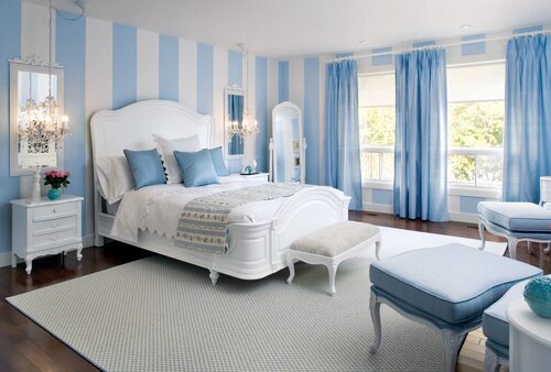 Просмотрите наши фотографии, чтобы найти вдохновение для оформления спальни с голубыми обоями и белой мебелью. Разнообразные стили и дизайнерские решения помогут вам выбрать подходящий вариант для вашего интерьера.