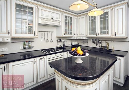 Кухня в классическом стиле с черной столешницей - это элегантное и изысканное решение для современного интерьера. Черная столешница придает кухонному пространству роскошный и стильный вид, создавая контраст с другими элементами декора.
